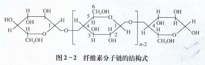 ①纖維素:纖維素是不溶于水的簡單聚糖,是由大量的D葡萄糖基彼此通過1,4位碳原子上的β糖苷鍵連接而成的直鏈巨分子化合物,具有特殊的x射線圖。纖維素的分子式可用(C6H10O5)n。表示,式中C6H10O5為葡萄糖基,n為聚合度。天然狀態(tài)下的棉、麻及木纖維素,n近于10000。纖維素分子鏈的結(jié)構(gòu)式如圖2-2所示。