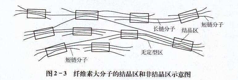 纖維素是木材細(xì)胞壁中“骨架”物質(zhì),主要為木材提供強(qiáng)度。纖維素纖維的物理結(jié)構(gòu)中,存在著由纖維索分子鏈高度整齊排列的結(jié)晶區(qū)部分和排列不整齊的非結(jié)晶區(qū)(無定型區(qū))部分(見圖2-3)。兩者沒有明顯的界限,但有相對的過渡。纖維素的無定型區(qū)有大量的游離羥基存在,羥基具有很性,能吸附很性水分子,形成氫鍵,因此,纖維素的無定型區(qū)具有吸濕性,結(jié)晶區(qū)則沒有。纖維素吸濕后,水分子會進(jìn)人無定型區(qū),與纖維素分子鏈的羥基形成氫鍵結(jié)合,使纖維素分子鏈間的距離增大,宏觀上反映為木材膨脹。纖維素?zé)o定型區(qū)所占的百分比越大,吸濕性就越大,會影響制品的物理力學(xué)性能,因此,選用原料和制定工藝時要從多方面加以考慮。